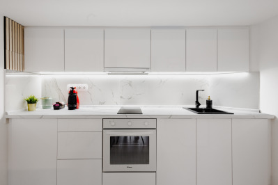 A konyha teljesen felszerelt. Mosogatógép, hűtő, mikró, kávéfőző, indukciós tűzhely, sütő, edények, étkészlet, evőeszközök.